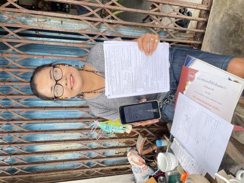 ลงพื้นที่ประชาสัมพันธ์สร้างการรับรู้ โครงการคนละครึ่งพลัส โดยมีนางสาวดาริน มียิ้ม ประธานกลุ่มฯ รับเอกสารลงทะเบียนคนละครึ่งพลัส เพื่อไปลงทะเบียนกับธนาคารกรุงไทย ต่อไป